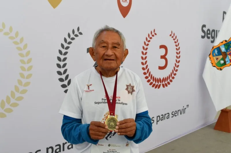 Ciudad Victoria, Tamaulipas. – Roberto Jiménez Sánchez, participante de la Segunda Carrera “por la Paz y la Seguridad en Tamaulipas” recibió un reconocimiento y premio por su perseverancia de parte de la Secretaría de Seguridad Pública de Tamaulipas (SSPT), puesto que, a sus 86 años se desempeña como atleta, demostrando que no existen límites para dedicarse a esta disciplina.