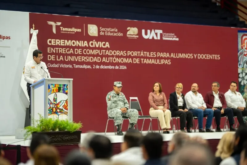 El gobernador encabezó la ceremonia cívica de honores a la bandera en el Gimnasio Multidisciplinario de la UAT, donde destacó la relevancia de este acto en el que, por primera vez, se hace entrega a los universitarios de este importante recurso para apoyar la labor docente y el esfuerzo de sus estudiantes para formarse con las mejores herramientas.