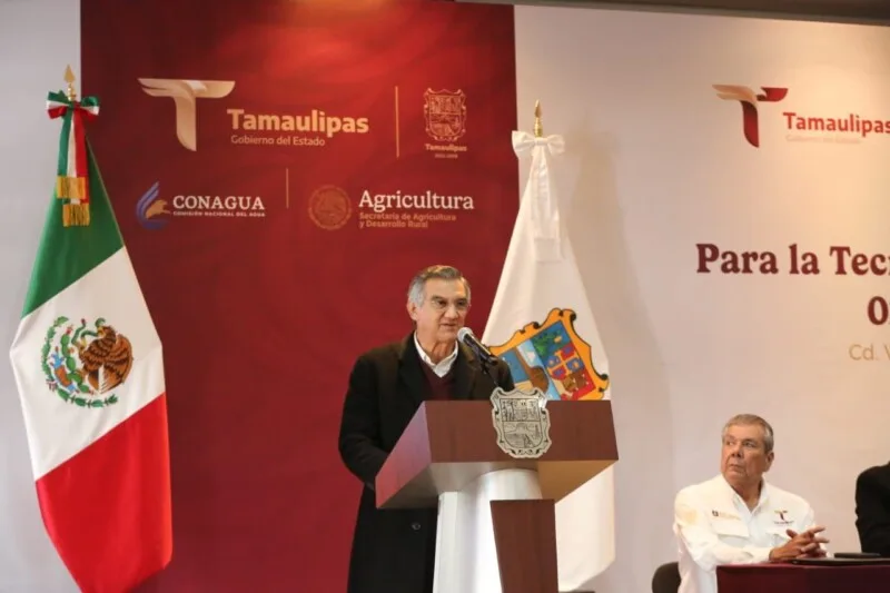 Ciudad Victoria, Tamaulipas.- Como parte del Plan Nacional Hídrico que impulsa la presidenta Claudia Sheinbaum, el gobernador Américo Villarreal Anaya firmó un convenio de colaboración entre la Comisión Nacional del Agua (CONAGUA), el Estado a través de la Secretaría de Recursos Hidráulicos de Tamaulipas, la Secretaría de Agricultura y Desarrollo Rural y los usuarios del Distrito de Riego 026 Bajo Río San Juan, que permitirá tecnificar 200 kilómetros de canales en el fronterizo Distrito de Riego con una inversión de más de 4,100 millones de pesos.