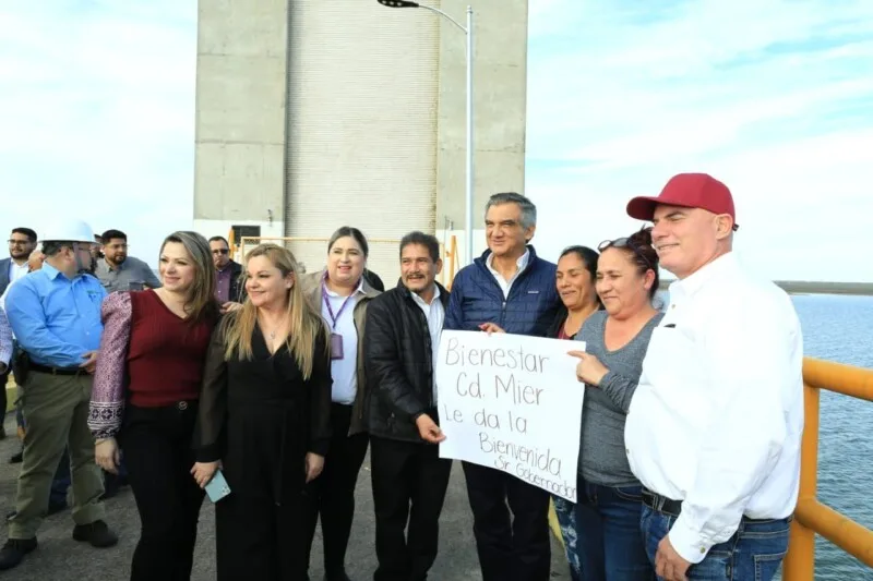 Como parte de su gira de trabajo en la zona ribereña, el gobernador, acompañado por la presidenta del DIF Estatal, doctora María de Villarreal, llegó hasta la estación hidrométrica Falcón, en los límites entre Tamaulipas y Texas, donde constató la crítica situación por los bajos niveles de esta presa internacional.