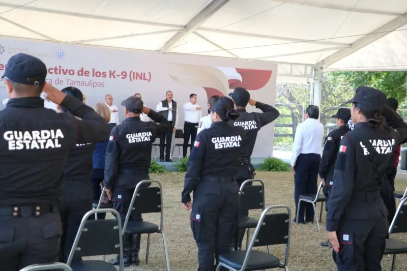 Ciudad Victoria, Tamaulipas.- Con una ceremonia de honores, la Secretaría de Seguridad Pública de Tamaulipas (SSPT) despidió a cinco agentes caninos de múltiples especialidades retirados del servicio activo, los cuales fueron adoptados por sus manejadores.