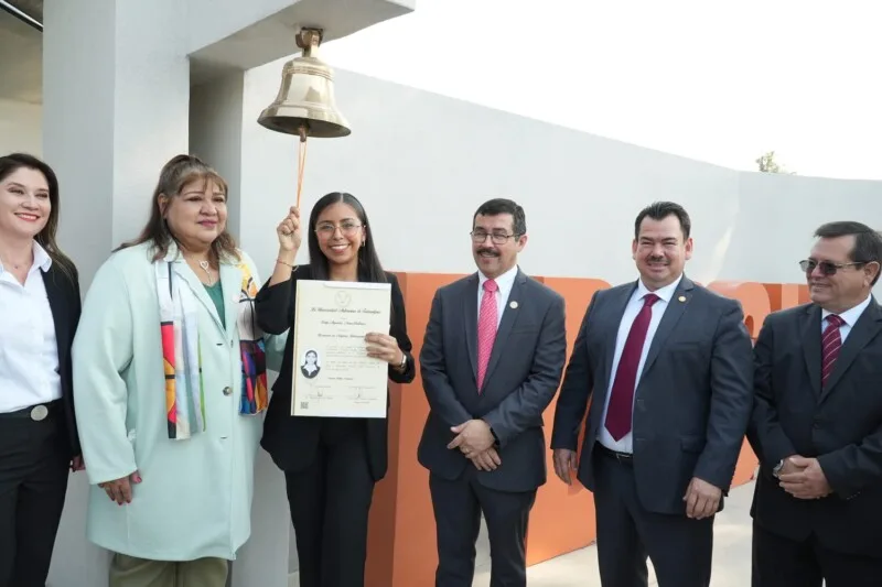 Posteriormente, inauguró la nueva fachada del estacionamiento, así como la campana universitaria, un nuevo espacio en el que, de manera simbólica, las y los recién titulados celebrarán su logro académico. Y, precisamente en este marco, el rector acompañó a tres exalumnas y sus familias en esta emotiva ceremonia, resaltando la trascendencia de este acto en la vida universitaria.