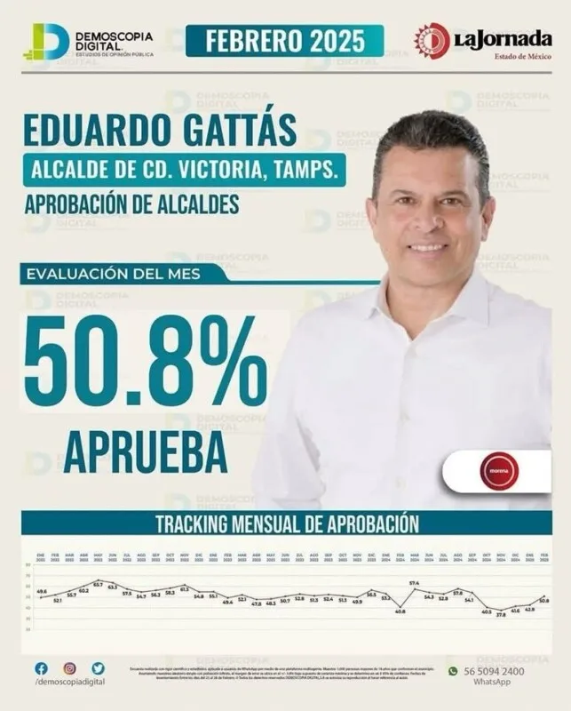 De acuerdo con el estudio de opinión del mes de febrero de 2025, la Casa Encuestadora ‘Demoscopia Digital’, ubicó a Gattás Báez en la cuarta posición del ranking de mejores alcaldes del Estado, con 50.8% de aprobación ciudadana.