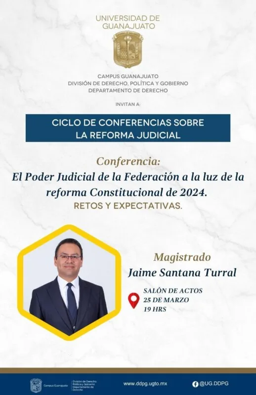 5.- Por cierto, todo está listo para este martes 25 de marzo para que se lleve a cabo en el Campus Guanajuato UG, División de Derecho, Política y Gobierno; Departamento de Derecho Invitan a: