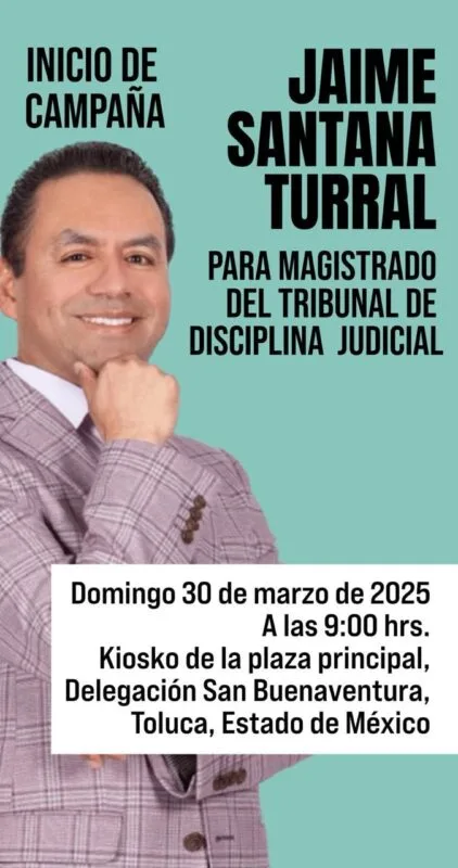 Total para esos cargos, el más visto y favorito para ocupar el Tribunal de Disciplina Judicial, es el Magistrado Mexiquense Jaime Santana Turral, quien desde muy temprana hora de este domingo salió en conquista del voto popular desde el kiosco de la plaza principal, Delegación San Buenaventura, Toluca Estado de México, por lo que no lo pierda de vista en el futuro inmediato, ya que es sin duda el bueno para ese cargo del TDJ, y dónde afirma: ¡Tu voz construye justicia y en la boleta turquesa va en el número 37, por lo que así lo identificará en la papeleta. A la vez el Magistrado Santana Turral, está comprometido con la Verdad, la Justicia y Contigo.