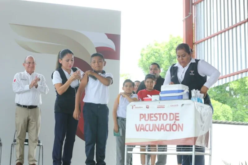 Como parte del inicio de la Semana Nacional de Vacunación en escuelas de educación básica, tres alumnos recibieron la aplicación del biológico, así como a una madre de familia embarazada.