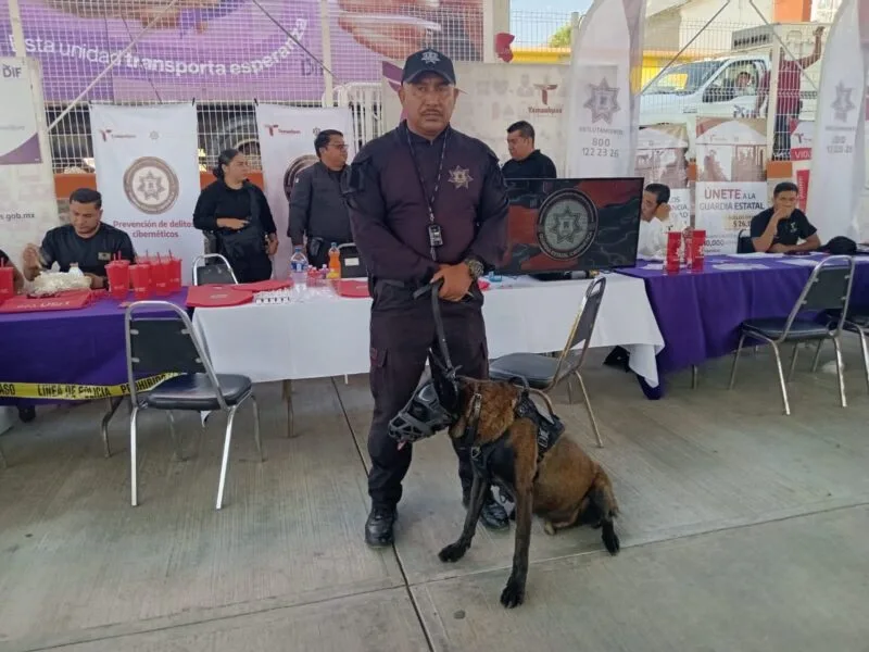 Los caninos Astrid y Anubis estuvieron presente junto a sus manejadores, quienes explicaron al público las funciones realizadas por este agrupamiento, los servicios que brinda y parte del entrenamiento que reciben los binomios K-9 de acuerdo a sus especialidades.