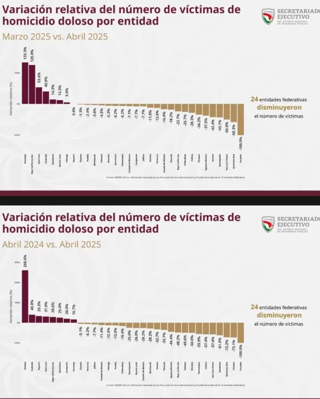Gracias a la coordinación y colaboración del Gobierno del Estado con el Gobierno Federal, el reporte señala que Tamaulipas redujo 6.2% la tasa de víctimas de homicidios dolosos respecto a marzo de 2025, y lo disminuyó un 55.9% en relación al mes de abril de 2024.