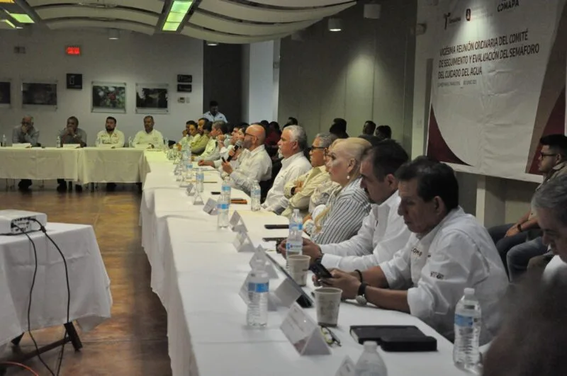 Gómez Farías, Tamaulipas. – El secretario de Recursos Hidráulicos, Raúl Quiroga Álvarez, encabezó la Vigésima Reunión Ordinaria del Comité de Seguimiento y Evaluación del Semáforo del Cuidado del Agua, acompañado por el presidente municipal de Gómez Farías, Frank De León Ávila. En el encuentro se aprobó la actualización del Semáforo del Agua, vigente a partir de junio, así como un balance hidráulico que explica la situación actual en las distintas cuencas del estado.