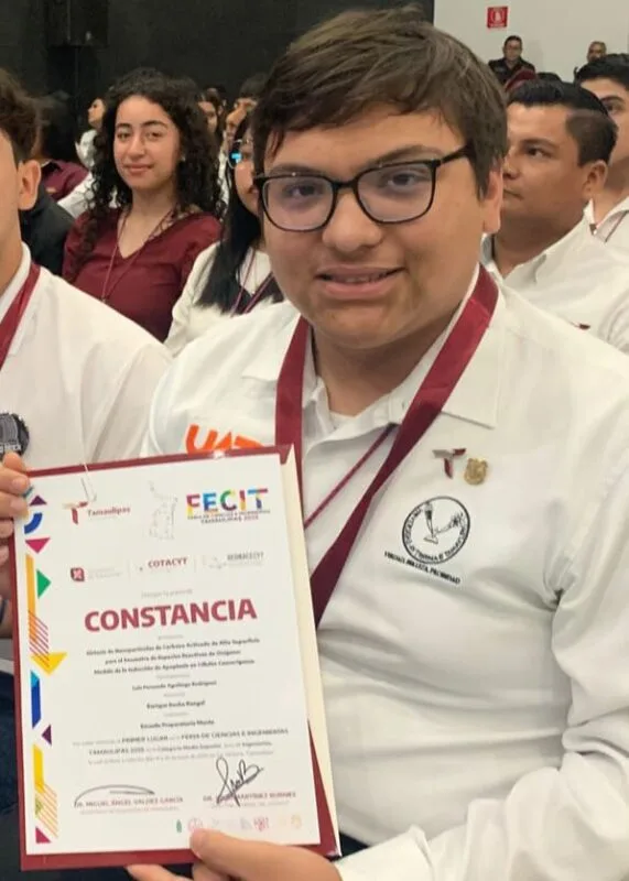 El proyecto de Luis Fernando, titulado “Síntesis de nanopartículas de carbono activado de alta superficie para el secuestro de especies reactivas de oxígeno: Modelo de la inducción de apoptosis en células cancerígenas”, obtuvo el primer lugar en la categoría de nivel medio superior en la Feria de Ciencias e Ingenierías Tamaulipas (FECIT 2025).