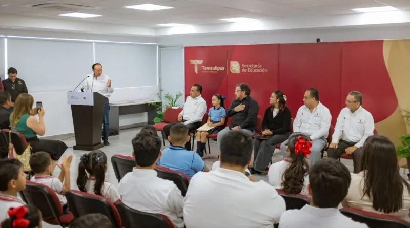 Ante un grupo de alumnas y alumnos de las escuelas primarias “Ejército Mexicano” y “Profr. Luis Humberto Hinojosa Ochoa”, de Victoria y de la Universidad Pedagógica de Victoria (UPV), el secretario de Educación de Tamaulipas, Miguel Ángel Valdez García, en representación del gobernador Américo Villarreal Anaya, presidió la ceremonia de arranque de la entrega de las becas “Avanza por las Niñas, Niños y Adolescentes de Tamaulipas” y “Futuro Tamaulipas, Jóvenes de Nivel Superior”.
