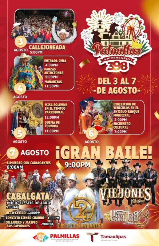 1.- Con jaripeo, coleadero, cabalgata, música y diversas actividades más conmemoran el 398 aniversario del municipio de Palmillas y todo está programado para este jueves 7 de agosto. La cabalgata inicia en el ejido 6 de abril en punto de las 9:00 horas, donde los jinetes ya estarán listos de partida y saldrán al más viejo estilo del oeste, a todo galope; almuerzo ahí mismo 8:00 de la mañana; acto cívico 12:00 del mediodía, para llegar a eso de las 13:00 horas al Lienzo Charro “Los Caporales”, donde será todo el guateque y por la noche grandioso baile para cerrar con broche de oro esta fiesta.
