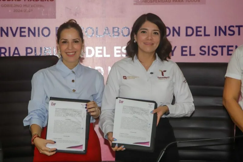 La firma del convenio se llevó a cabo en la Sala de Cabildo del H. Ayuntamiento de Ciudad Madero, con la participación de la presidenta del DIF, Dunia Marón, y la directora general del organismo, Neffertitti Constantino Martínez.
