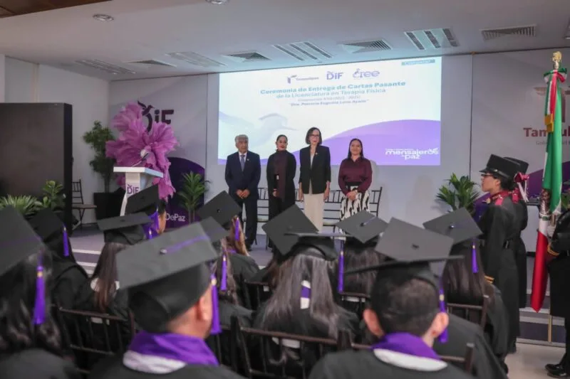 Ciudad Victoria, Tamaulipas. El Sistema para el Desarrollo Integral de la Familia de Tamaulipas, que preside la doctora María de Villarreal, llevó a cabo en el auditorio principal de esta institución la ceremonia de entrega de cartas de pasante a 24 nuevos profesionistas egresados de la Licenciatura en Terapia Física del Centro de Rehabilitación y Educación Especial (CREE), dependiente de este sistema.