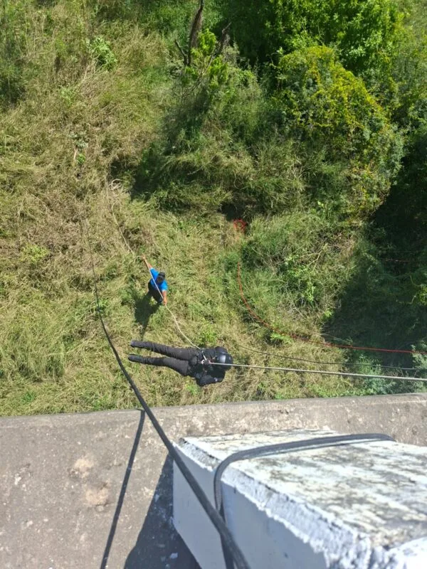 Esta capacitación fue impartida por el Coordinador del Curso de Paramédicos de la Escuela de Centro de Formación y Profesionalismo, además de la teoría, se llevó a cabo una práctica de descenso en rapel en el Puente San Felipe.