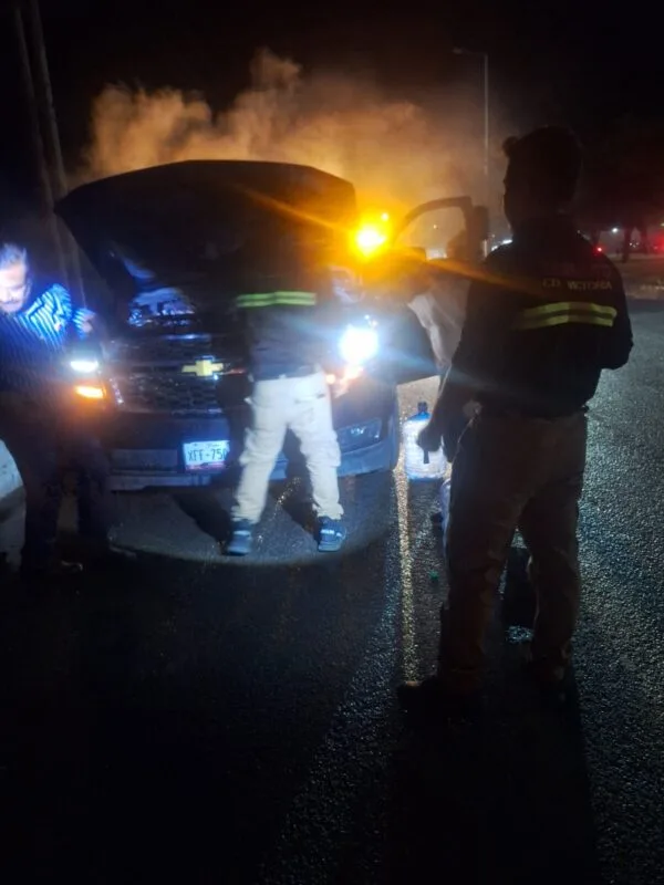 En un recorrido de vigilancia permanente, los elementos de tránsito local de la unidad 75 se percataron que una camioneta se empezó a incendiar la noche de este miércoles, por lo que ayudaron al conductor a ponerse a salvo y apagar el fuego con garrafones de agua y con palas de tierra.