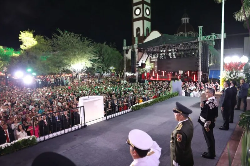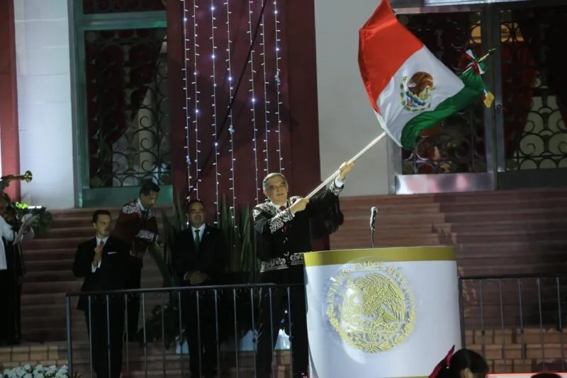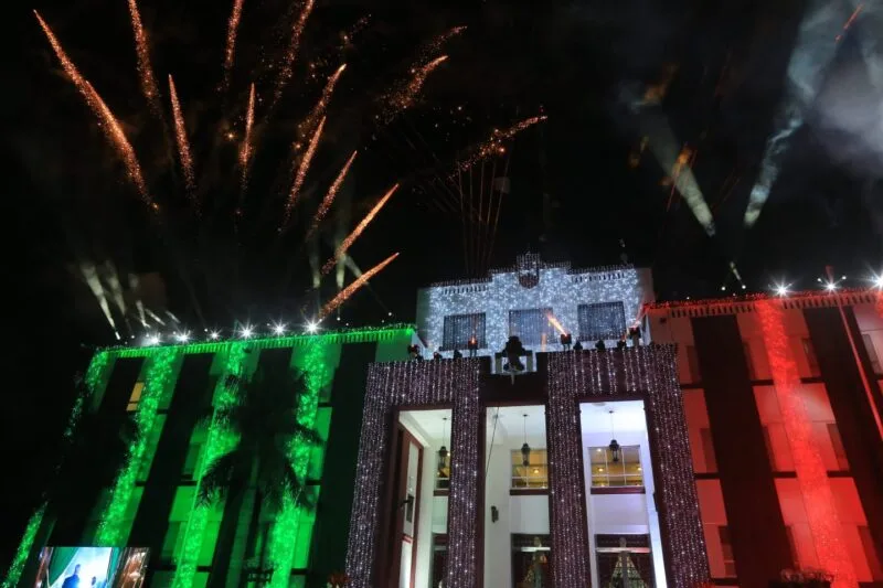 Ciudad Victoria, Tamaulipas. – Miles de familias tamaulipecas se congregaron en la Plaza Juárez de esta capital para conmemorar el 215 aniversario del Grito de Independencia, acto encabezado por el gobernador Américo Villarreal Anaya, quien en su arenga vitoreó a nuestros hermanos y hermanas migrantes, a la honestidad y la justicia, y a los independentistas tamaulipecos.