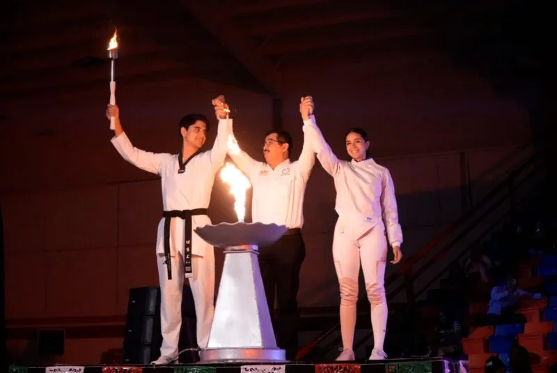 Dámaso Anaya entregó material deportivo a los equipos y encabezó el encendido del pebetero con el Fuego Universitario, junto con los estudiantes medallistas en torneos nacionales, Regina Pedraza, de la disciplina de Esgrima, y Roberto Garza, de Taekwondo.