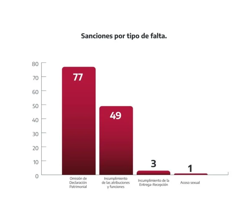«Las faltas en las que incurrieron las 130 personas servidoras públicas sancionadas arrojan 77 casos por omisión de declaración patrimonial, 49 por incumplimiento de las atribuciones y funciones que mandata el marco legal para actuar, tres por incumplimiento en los actos de entrega-recepción y un caso por acoso sexual”, agregó la secretaria Anticorrupción Norma Angélica Pedraza Melo.
