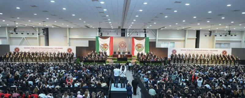 Durante la sesión pública, extraordinaria y solemne del Congreso del Estado, en el Polyforum de esta capital, y luego de la toma de protesta de las y los 147 magistrados y magistradas y juezas y jueces, a cargo del presidente de la Junta de Gobierno, diputado Humberto Prieto Herrera, el gobernador destacó que este acto deja para la posteridad y una imagen inédita, con la concurrencia del pleno de los tres Poderes del Estado, “pero esta vez todos con la legitimidad democrática y la autoridad moral que otorga el respaldo del pueblo”, expresó.