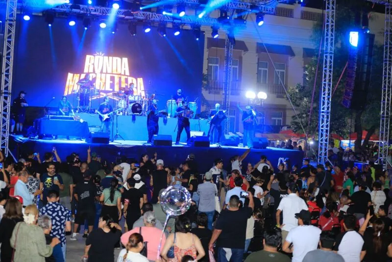 Simultáneamente, en la Plaza Juárez, el ritmo se apoderó de la noche con la presentación de La Ronda Machetera, agrupación nacida de la fusión de La Ronda Bogotá y Pato Machete, que rindió homenaje al inolvidable Celso Piña con un vibrante espectáculo de cumbia y hip hop.