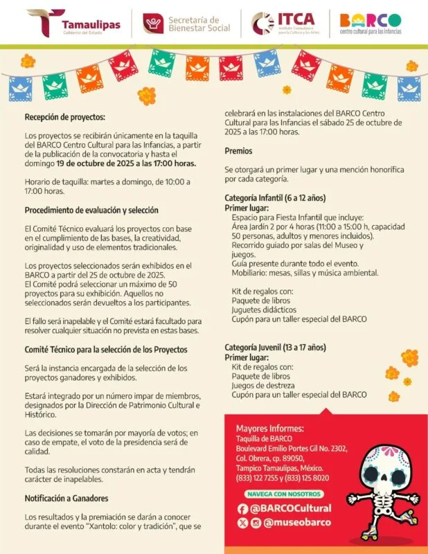 Tampico, Tamaulipas.-Para conmemorar el Día de Muertos, una de las celebraciones más emblemáticas de México; el Gobierno del Estado de Tamaulipas, a través del Instituto Tamaulipeco para la Cultura y las Artes y el centro cultural para las infancias BARCO, llevará a cabo una jornada de actividades culturales, artísticas y familiares en el sur del estado, por lo que invitan a las comunidades de Tampico y municipios cercanos a participar en las diversas actividades como el Concurso de Mini Altares.