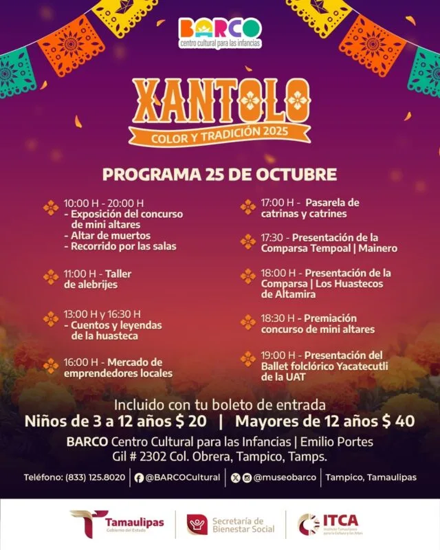 Entre las actividades más esperadas de la época y que se realizarán en BARCO, destaca el Xantolo 2025, en donde habrá presentación de las comparsas Tempoal Mainero y Los Huastecos de Altamira, el Ballet Folclórico Yacatecutli de la UAT, talleres de arte, cuentos y leyendas de la huasteca, así como un mercado de emprendedores locales que llenará de vida el recinto.