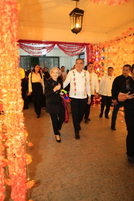 Ciudad Victoria, Tamaulipas.- En un ambiente impregnado por el aroma de la flor de cempasúchil, el pan de muerto y las luces de las velas, el gobernador Américo Villarreal Anaya y la presidenta del Sistema DIF Estatal, María de Villarreal presidieron la premiación del concurso estatal de catrinas y catrines «Almas Tamaulipecas» y la muestra del altar monumental del Día de Muertos en las escalinatas de Palacio de Gobierno .
