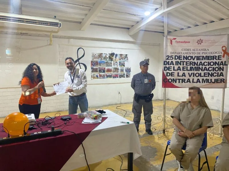 Altamira, Tamaulipas. – Entre las actividades conmemorativas del Día Internacional para la Eliminación de la Violencia contra las Mujeres, desempeñadas por la Secretaría de Seguridad Pública de Tamaulipas (SSPT) el Centro de Ejecución de Sanciones (CEDES) del municipio de Altamira llevó a cabo un torneo relámpago de voleibol y una conferencia a cargo del psicólogo de la Fiscalía General de Justicia del Estado de Tamaulipas (FGJT), Juan Gabriel Solís Tavera.