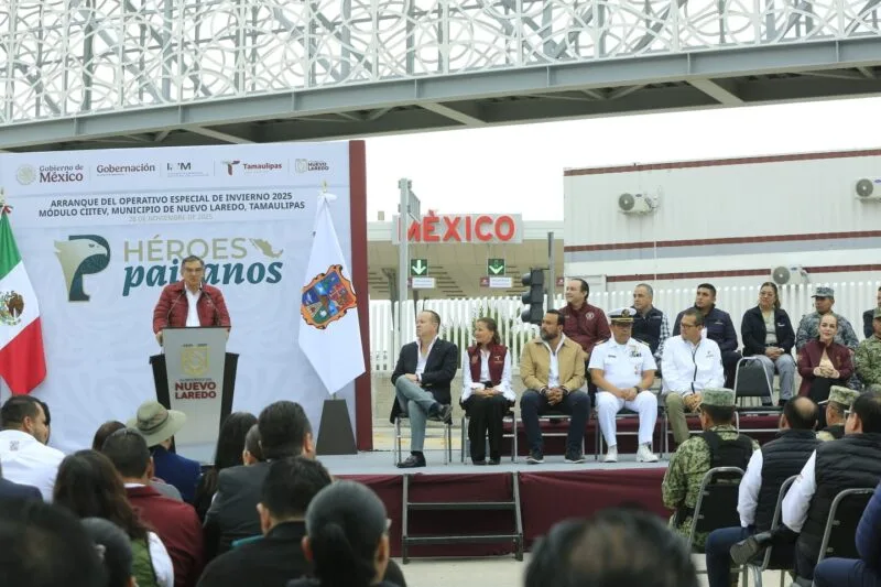Al dar el banderazo de inicio del Operativo Especial Invierno 2025 del Programa “Héroes Paisanos”, en la explanada del módulo de Control de Importación e Internación Temporal de Vehículos (CIITEV) del Puente Internacional Juárez-Lincoln, Américo Villarreal aseguró que los miles de paisanos que llegan a través de esta frontera tamaulipeca van a encontrar autoridades diligentes, honestas y dispuestas, que se han coordinado entre los tres órdenes de gobierno para acompañar su retorno brindando seguridad, toda clase de servicios y la atención que se merecen.