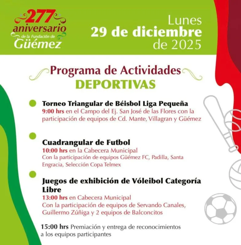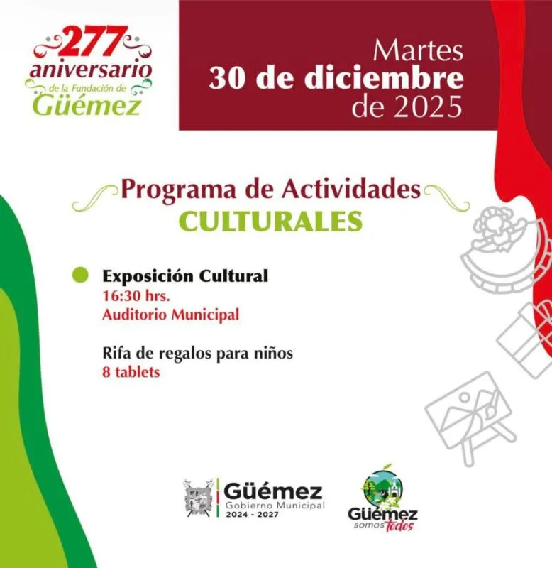 1.- Por cierto, este lunes 29 de diciembre se da inicio a los festejos conmemorativos del 277 Aniversario de la Fundación de la Villa de Güémez, Tamaulipas, según dicho por su alcalde José Lorenzo Morales Amaro.
