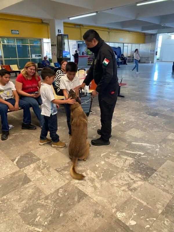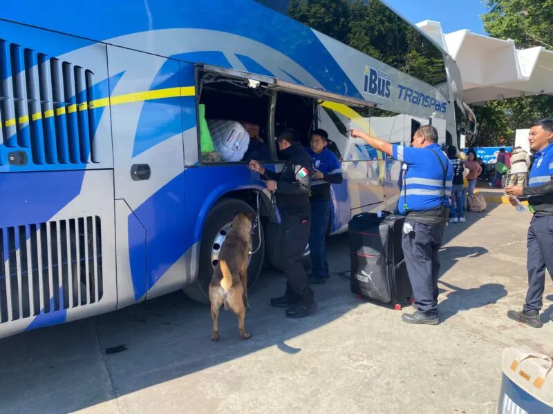 Durante la intervención, el canino “Looky” realiza barridos preventivos en pasillos, sala de espera, andenes, áreas comunes y la zona de paquetería, además de la inspección de maletas y autobuses de distintas líneas de transporte foráneo.