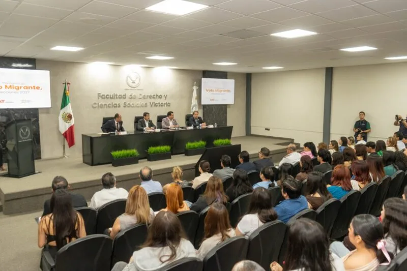 Ciudad Victoria, Tam.; 24 de marzo de 2026.- Como parte del compromiso de la Universidad Autónoma de Tamaulipas (UAT) con la formación integral, se llevó a cabo la conferencia «Voto Migrante, Elecciones 2027». El evento, encabezado por el rector Dámaso Anaya Alvarado, analizó los derechos políticos de los mexicanos en el extranjero, con la participación del especialista Manuel Alejandro Robles Gómez y el alcalde de Tula, René Lara Cisneros.
