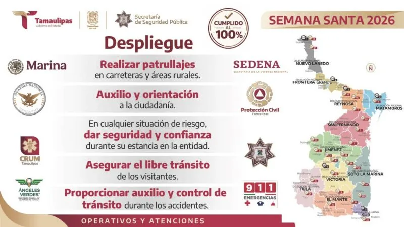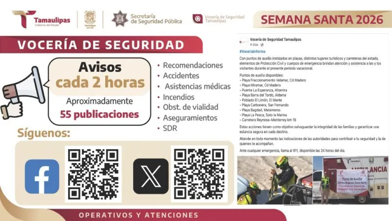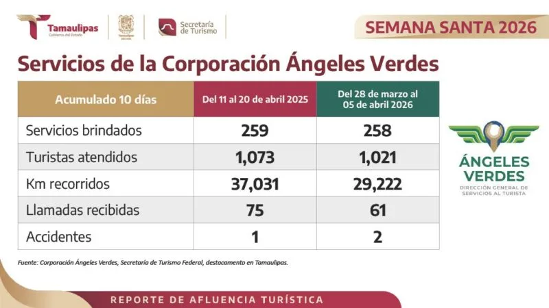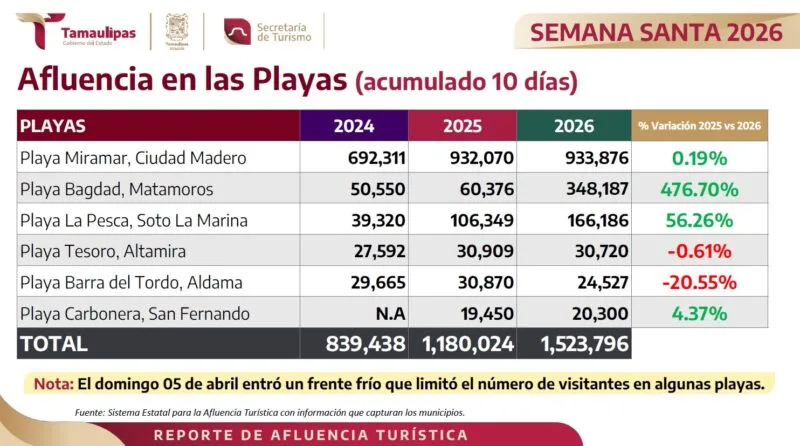 El secretario de Turismo, Benjamín Hernández, detalló que durante la Semana Santa 2026 se registraron 2,141,272 visitantes a sitios turísticos; 265 mil 720 personas más que en el mismo periodo del año anterior, lo que representa un incremento del 14.16%, con una derrama económica en 10 días de 2,153,794 pesos, destacando la playa Miramar, de Madero, con 933,876 visitantes, y playa Bagdad con 348,187 visitantes, un incremento en este sitio de 476% respecto a 2025, en el municipio de Matamoros.