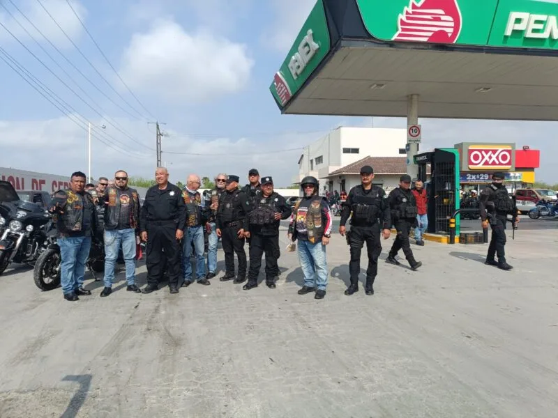 Jiménez, Tamaulipas.– Personal de la Guardia Estatal desplegó un operativo de seguridad para resguardar el paso de una caravana internacional de motociclistas que ingresó al estado con destino a El Salvador.