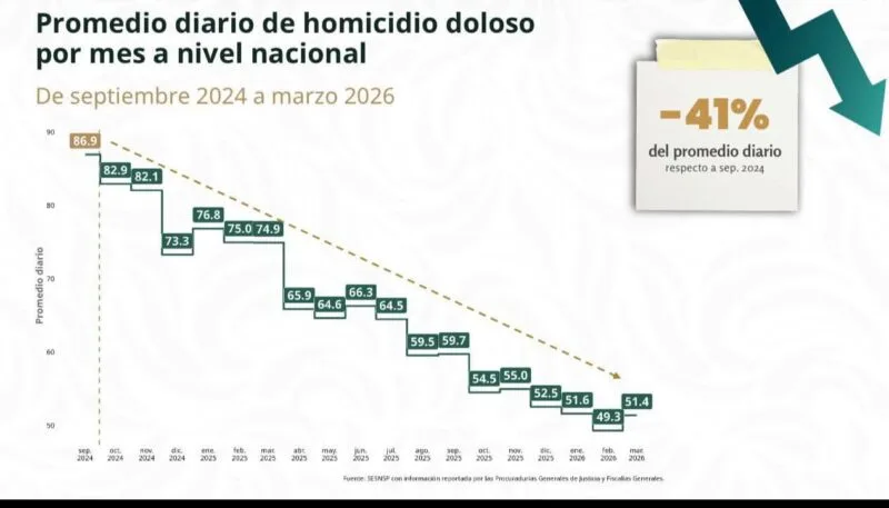 En México, los homicidios dolosos disminuyeron 41 por ciento al pasar de un promedio diario de 86.9 en septiembre de 2024 a 51.4 en marzo de 2026.