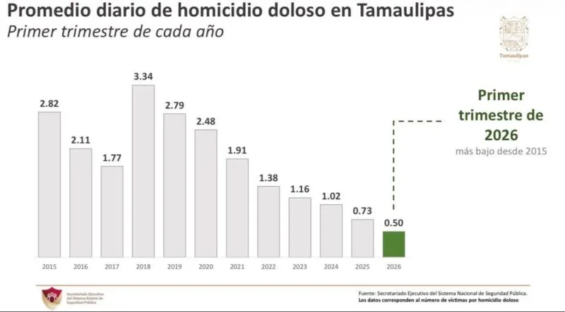 El Secretariado Ejecutivo del Sistema Nacional de Seguridad Pública detalló que durante el primer trimestre de 2026, Tamaulipas consolidó esta tendencia a la baja, la cual se ha registrado desde el inicio de la actual administración estatal.