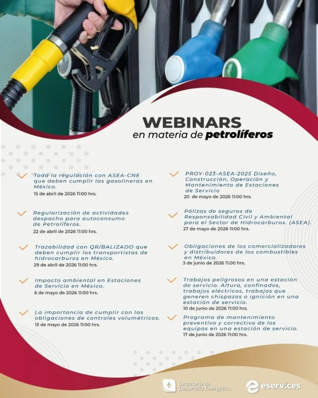 Indicó que las sesiones se llevarán a cabo todos los miércoles, hasta el 17 de junio, a las 11:00 horas (tiempo del centro), en modalidad virtual. Durante estos encuentros se abordarán temas como las regulaciones aplicables a estaciones de servicio y autoconsumo, el cumplimiento de controles volumétricos de combustibles, la contratación de pólizas de responsabilidad civil y ambiental, así como la obligación del balizado en unidades de transporte de combustibles, entre otros aspectos relevantes.